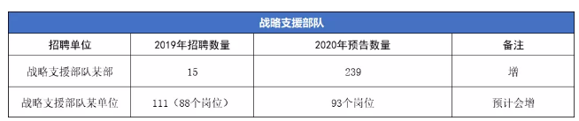 戰略支援部隊是一個大的系統,根據已經發布的機構崗位數量來看,新增的招考數量和崗位數量都有明顯的變化,預計戰略支援部隊招錄文職人員會更多。